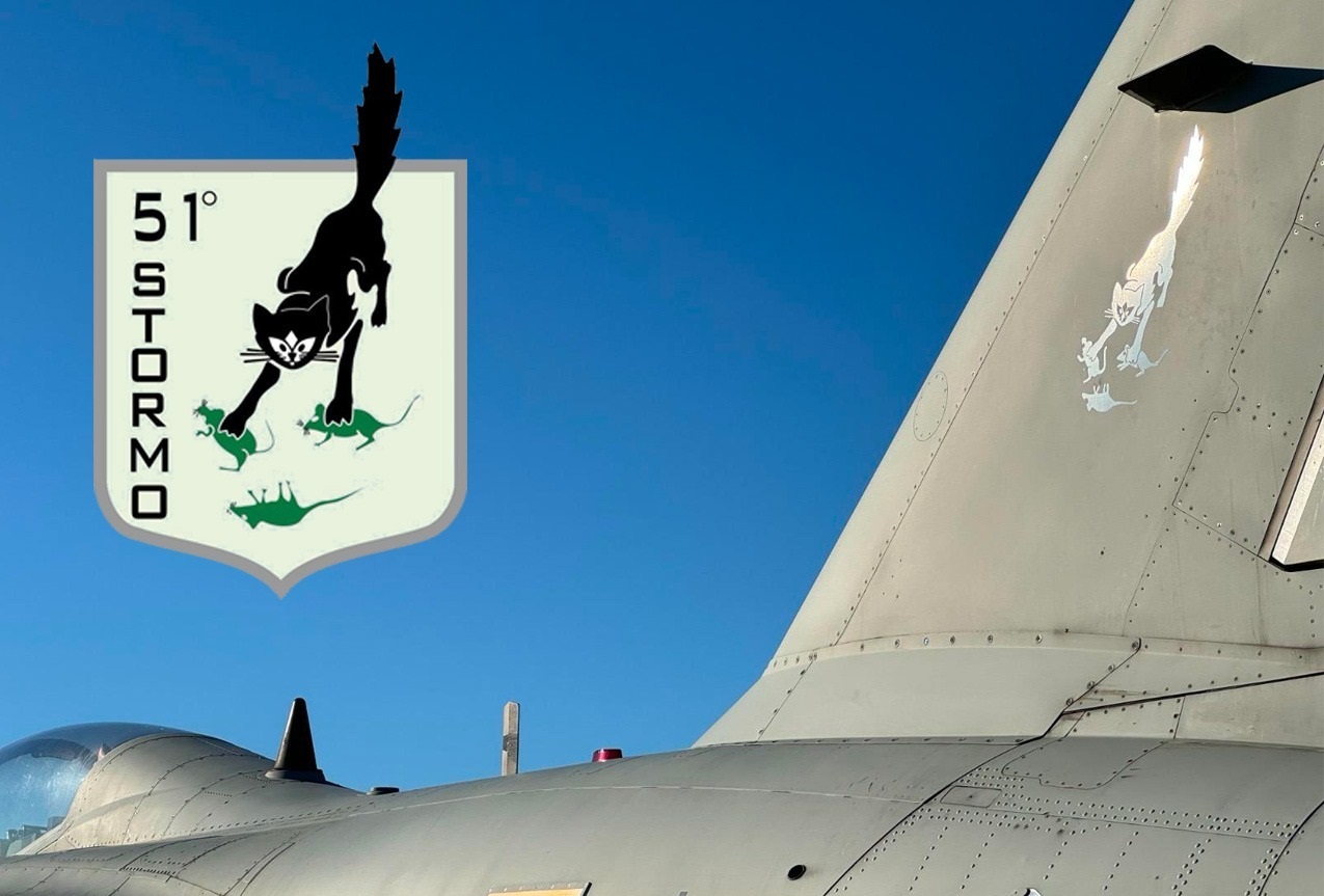 L’origine et la signification de cet emblème remontent aux années précédant la Seconde Guerre mondiale, au cœur d’un débat nourri entre partisans des chasseurs et des bombardiers. À l'époque, la thèse prédominante soutenait l’autosuffisance des bombardiers S-79 face aux chasseurs. Pourtant, lors d'un exercice d’attaque de Rome, la défense de la ville fut confiée à la 351e escadrille de la 51e escadre, équipée de monoplans G-50. Les pilotes exploitèrent si habilement les capacités de leurs chasseurs qu'ils dispersèrent la formation compacte des S-79, empêchant l’attaque sur la capitale. À l'issue de l’exercice, un pilote de la 351e dessina sur la dérive de son avion un chat noir saisissant dans ses griffes les trois souriceaux verts, symbole des unités de bombardement. Ce dessin fut adopté comme insigne officiel de la 51e escadre.