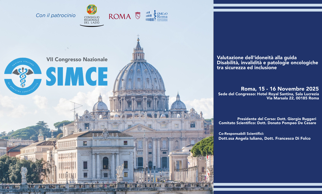 Si terrà a Roma, presso la Sala Lucrezia dell'Hotel Royal Santina, il VII Congresso della Società Italiana di Medicina del Conducente e della Sicurezza Stradale (SIMCE). L'evento, che si svolgerà il 15 e 16 novembre 2025, avrà come tema centrale la “Valutazione dell’idoneità alla guida: disabilità, invalidità e patologie oncologiche tra Sicurezza ed Inclusione” ed è accreditato ECM per tutte le discipline medico-chirurgiche, oltre a farmacisti, psicologi, e tecnici delle varie professioni sanitarie.