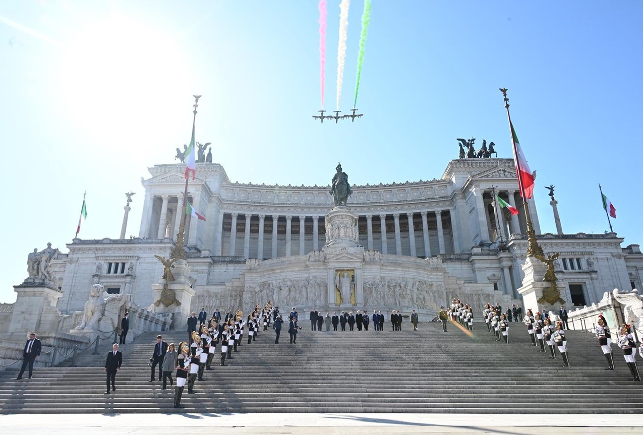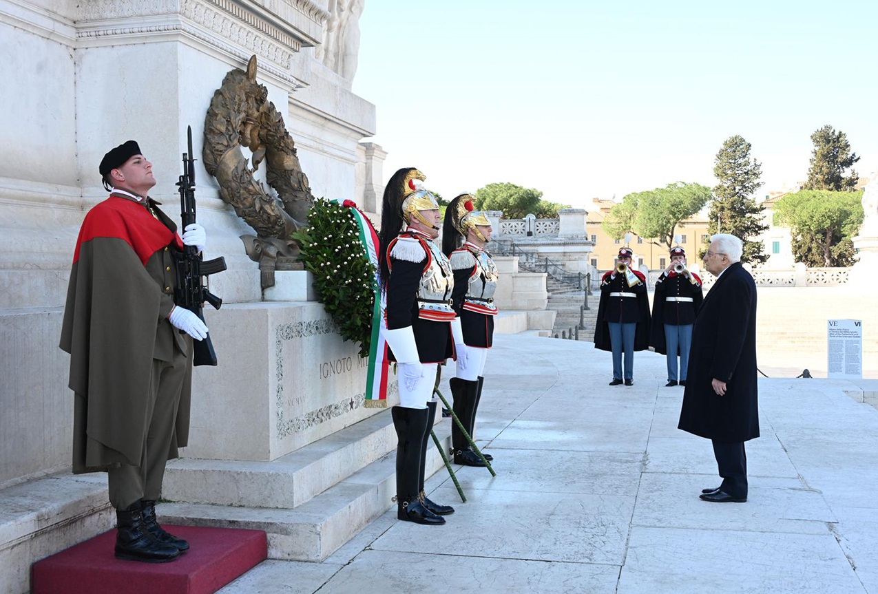 In occasione della Giornata dell’Unità Nazionale, della Costituzione, dell’Inno e della Bandiera, il Presidente della Repubblica, Sergio Mattarella, accompagnato dal Ministro della Difesa, Guido Crosetto, ha deposto una corona d'alloro al Sacello del Milite Ignoto all'Altare della Patria.
