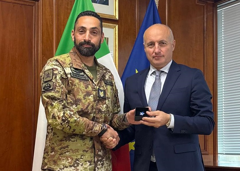 Palazzo ESTO - Il Segretario Generale della Difesa, Consigliere Fabio Mattei, ha ricevuto dal Sergente Maggiore Andrea Adorno, Medaglia d’Oro al Valor Militare, la spilla raffigurante il “Myosotis”, simbolo di tutti i caduti per la Patria.