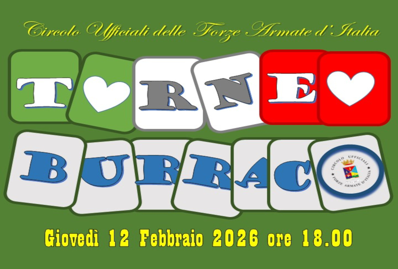 è un piacere comunicarLe che, nell’ambito delle attività culturali e ricreative di questo Circolo, è stato programmato, per il giorno Giovedì 12 Febbraio 2026, un Torneo di "Burraco con premi e cena".
