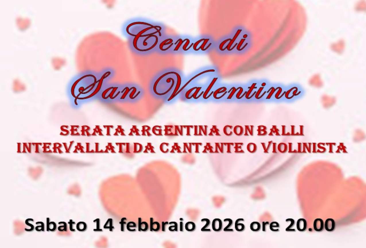 è un piacere comunicarLe che, nell’ambito delle attività culturali e ricreative, per il giorno di San Valentino, Sabato 14 Febbraio 2026 ore 20.00, gli innamorati potranno festeggiare con una cena esclusiva. La cena sarà accompagnata da una serata argentina con balli intervallati da cantante o violinista .