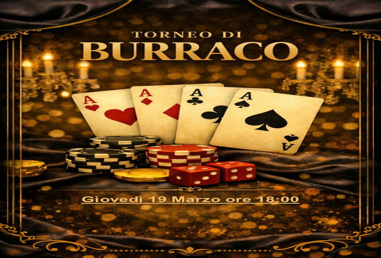 è un piacere comunicarLe che, nell’ambito delle attività culturali e ricreative di questo Circolo, è stato programmato per il giorno Giovedì 19 Marzo 2026 un Torneo di "Burraco con premi e cena".