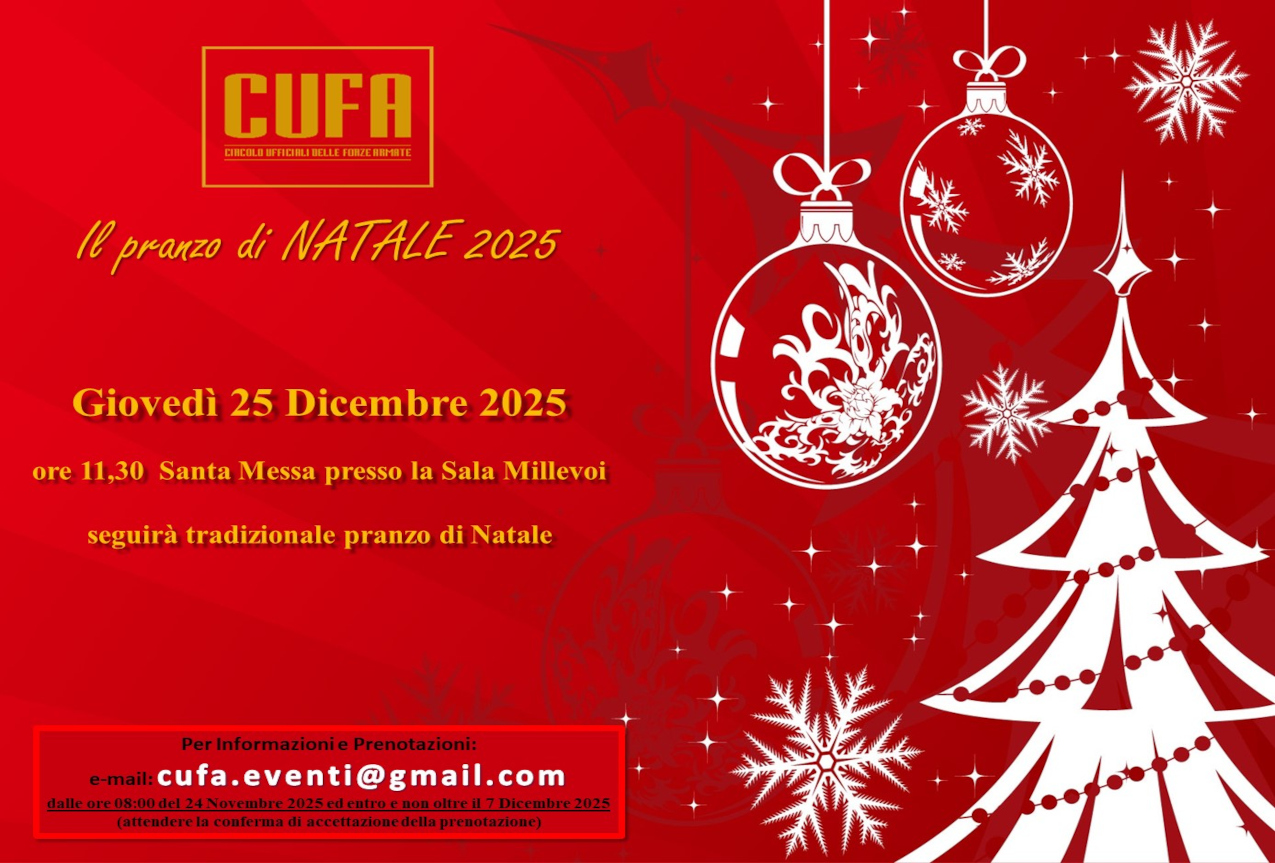 Le prenotazioni dovranno pervinire al seguente indirizzo email cufa.eventi@gmail.com esclusivamente a partire dalle ore 08:00 del giorno 24 Novembre 2025 ed entro e non oltre il 7 Dicembre 2025, salvo esaurimento disponibilità.