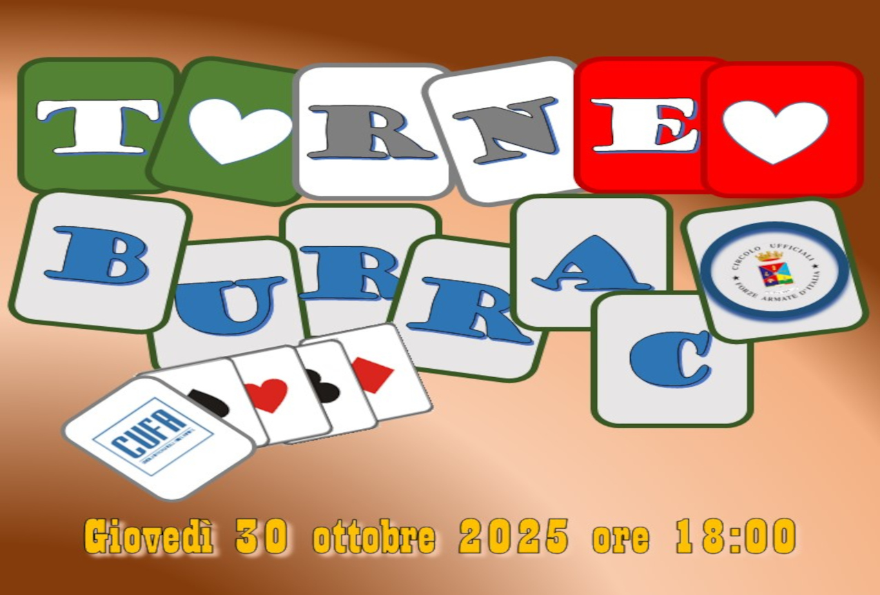 è un piacere comunicarLe che, nell’ambito delle attività culturali e ricreative di questo Circolo, è stato programmato, per il giorno Giovedì 30 ottobre 2025, un Torneo di "Burraco con premi e cena".