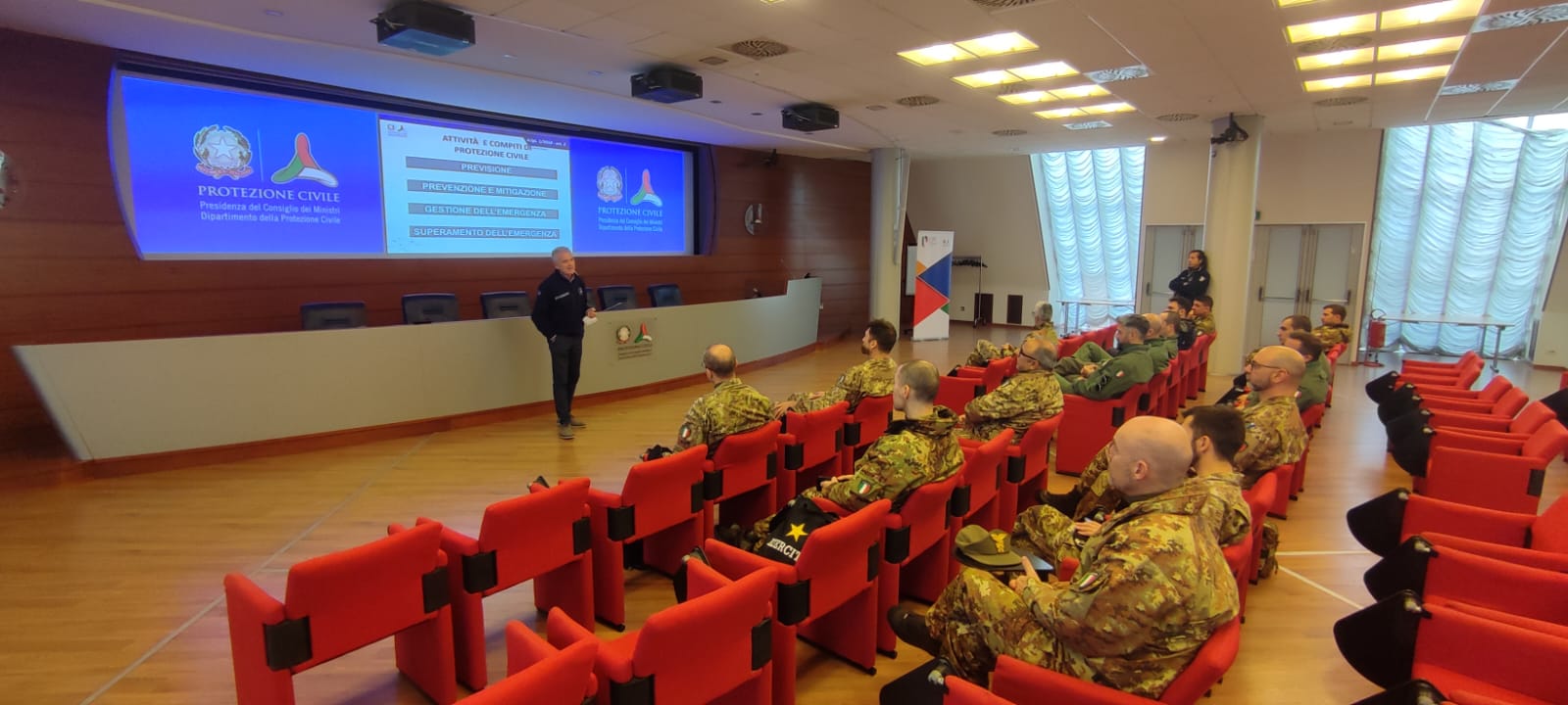 Nell'ambito del corso di AEROCOOPERAZIONE, i frequentatori hanno potuto inoltre effettuare una visita conoscitiva presso la sede operativa del Dipartimento della Protezione Civile di Roma. In tale ambito, i Funzionari Giovanni CAMMARONE e Claudio MONTEFERRI hanno illustrato le precipue attività del loro Dipartimento, permettendo ai frequentatori di immergersi nella realtà operativa della Protezione Civile e di capire le reciproche possibilità di collaborazione con le Forze Armate. I funzionari hanno inoltre permesso la visita delle varie sale operative, illustrandone le potenzialità e le peculiari caratteristiche, ottenendo il plauso e l'attenzione dei militari.